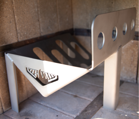 Parrilla plegable construida en acero inoxidable para uso en espacios abiertos.